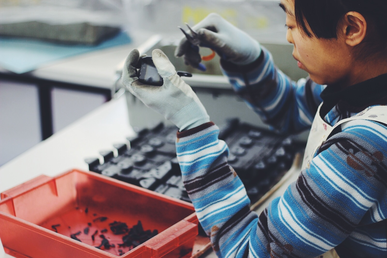 工房の作業室。片隅からFMラジオが流れます。白い作業台が不規則に並べられた空間です。ですから、工房のメンバーの向きも人数もバラバラ。でも、そこはそれぞれが根づいたお気に入りの席なのです。仕事は、主に企業からいただいた下請け作業。何種類かのバケットが高さを競っています。それは、「これだけは今日できる」という証。長年かかわる間に腕を上げました。みんな得意とするパーツをいくつか持っています。美しい仕事をします。それにひとりではわずかな成果でも「ひこばえ組」でかかれば「なかなか」なものなのです。これが職人集団を名乗る所以です。職人は、自分の受け持った仕事の手を抜きません。その達成感が気持ちいいのです。自分らしさを失わず、この気持ち良さを味わえる場所。これはわたしたちの宝物です。